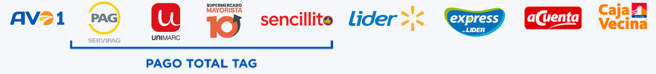 Acude al lugar de pago más cercano, indica que pagarás el Pago Total TAG o la cuenta de AVO y tu Rut. Si tienes más de un convenio TAG, sugerimos el Pago Total TAG. Los pagos realizados a través de recaudadores externos podrían tardar hasta 72 horas en actualizarse.